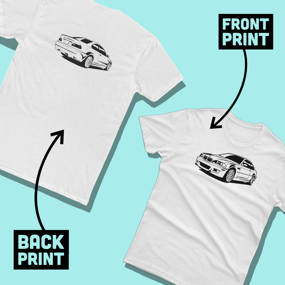 It's hard to pick just one "good side" to this svelte six-cylinder screamer, which is why this tee comprises two different views: a frontal angle printed on the front and a rear angle printed on the back of the same shirt.
